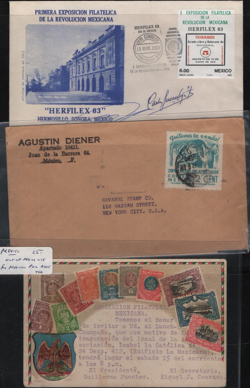Group seals, covers & ephemera related to philatelic shows, organizations & anniversaries; one binder is all Mexico w/ many EFIMEX 68 items, stamp centennial & more; other binder mostly Great Britain incl Philatelic Congress labels incl full sheets, air post expo, stamp centennial & more; attractive items, some dup, gen F-VF ex-Trenchard (Proceeds benefit APS) (Image)