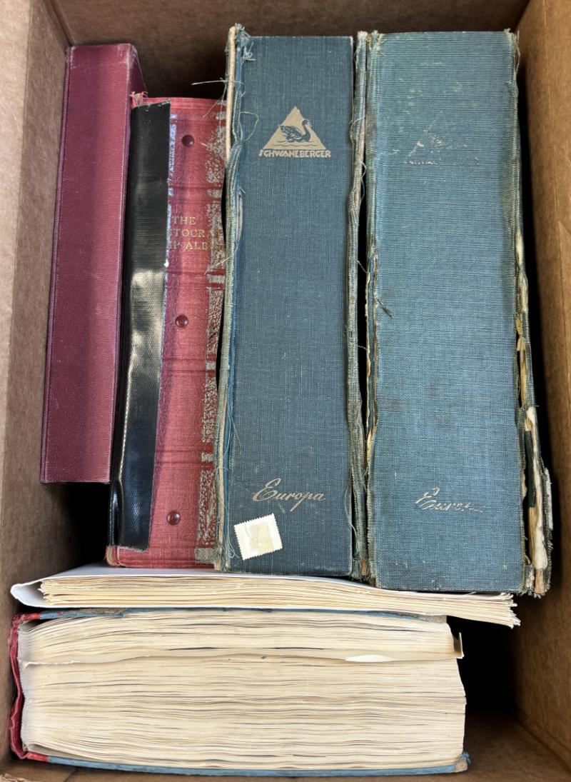Overlapping mainly used collections (1000s) 19/20th Cent, lightly to moderately filled collections incl 1926 (some countries added pgs to 1929) & 1930 Schwaneberger Europa albums, 1956 Grossman Aristocrat, 1962 Minkus New WW, 1947 Scott Intl Part 1, Egypt & Poland on Scott pgs to 1950s, also incl WW accum in abt (100) glassines & 102 cards & (2) baggies, some light dup; few flts to gen F-VF (Image)
