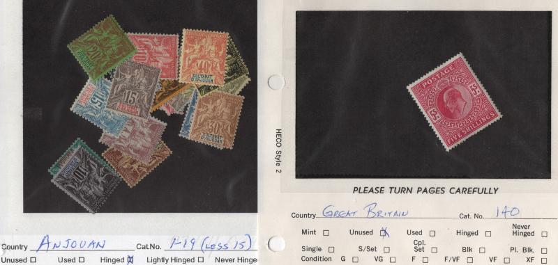 Selection of better WW stamps but most w/ some fault; used unless noted, Anjouan #1-19 H (less #15); Eritrea 47 HR no faults, J3a H, Germany 25 shallow thin, crease, 28 thin; GB 140 DG; Italy C55 CTO cancel; Italian offices in Constantinople J1-4 H w/ control mark; New Zealand 130E/137E favor cancels; Sweden J7 crease; Victoria #2a V pair no margins; F+ (Image)