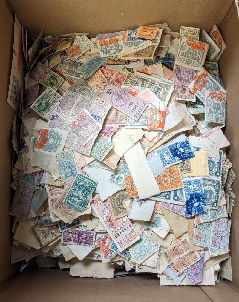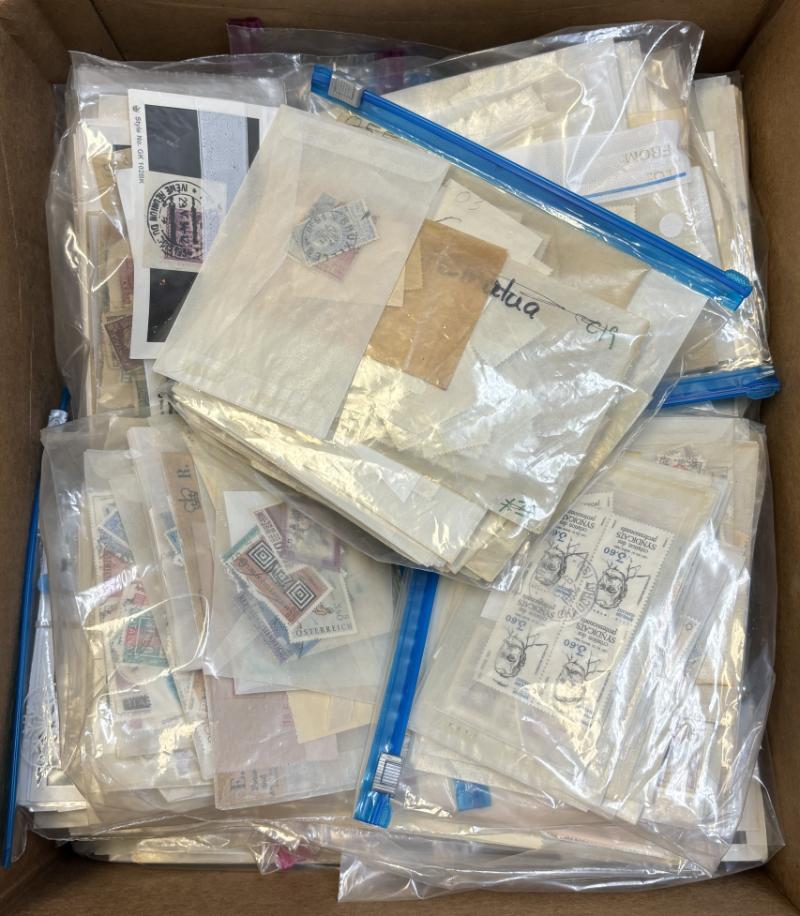 Accum (1000s) abt 2 lbs mostly off paper w/ some on document pieces loose, early 20th Cent w/ much GB & Brit Commonwealth, some other countries & a little US mixed in; also incl abt (100) Registered labels mostly Australian States; mixed cond flts to F-VF (Image)