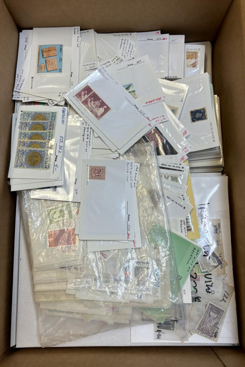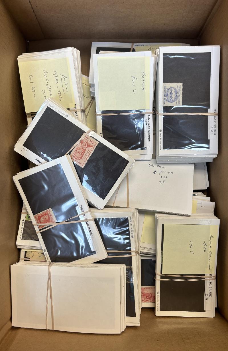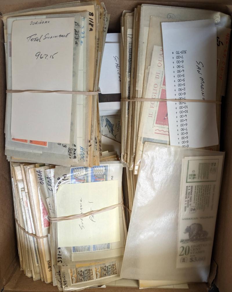 Dealer Stock (1000+) glassines w/ (1000s) mostly NH & a few LH/H, all unused w/ dup in mainly Blks, owner IDed & CV (NV), countries & CV for each, Bosnia & Herzegovina $127, Dominican Republic $85, San Marino $304, St Helena $546, Sudan $115, Suriname $767, Turkey $2,680, many Topicals in this group, nice lot for dealer or eBay, most VF (Image)