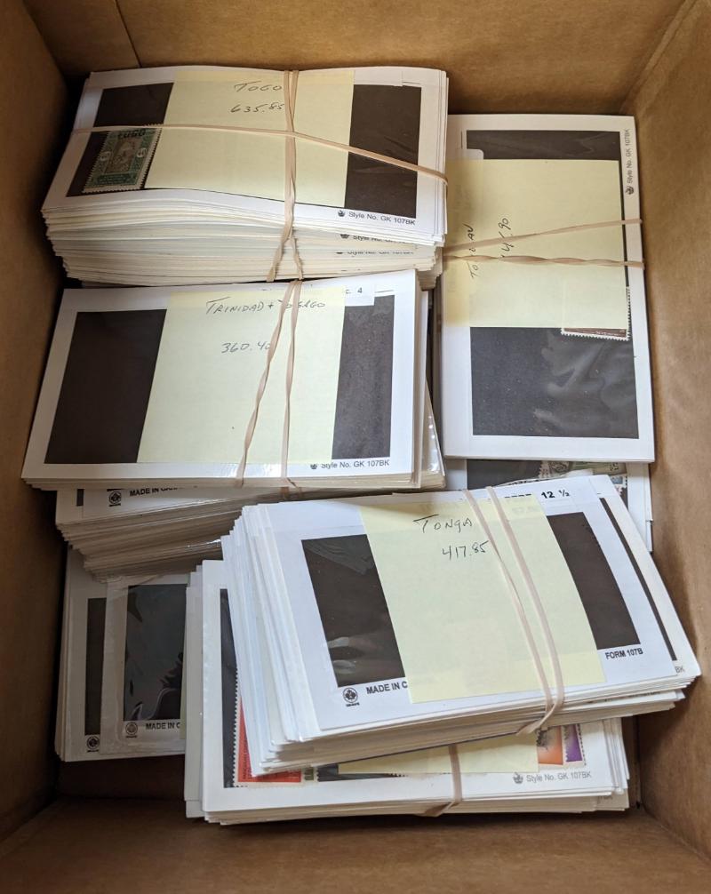 Dealer Stock (1000s) & (1000s) */O on 107 cards, singles, cplt set, S/S bklts w/ dup, owner IDed & CV (NV) w/ total CV $6,208, countries w/ CV incl Argentina $230, Armenia $164, Aruba $71, Ascension $354, Gold Coast & area $401, Indo-China $306, Indonesia $1,582, Iran $669, Thailand $576, Timor $94, Togo $636, Tokelau 146, Tonga $418, Transvaal $124, Trinidad & Tobago $360, Tristan Da Cunha $78, few flts not counted, most F-VF+ (Image)
