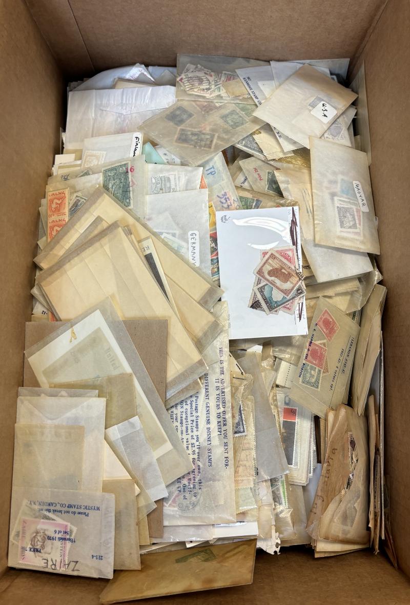 Accum many, many (1000s) */O packed into (1000s) glassines & envs, some glassines & envs labeled by country, many are random WW mixes, variety of countries & time periods; some dup; few flts but gen F-VF H/NH (Image)