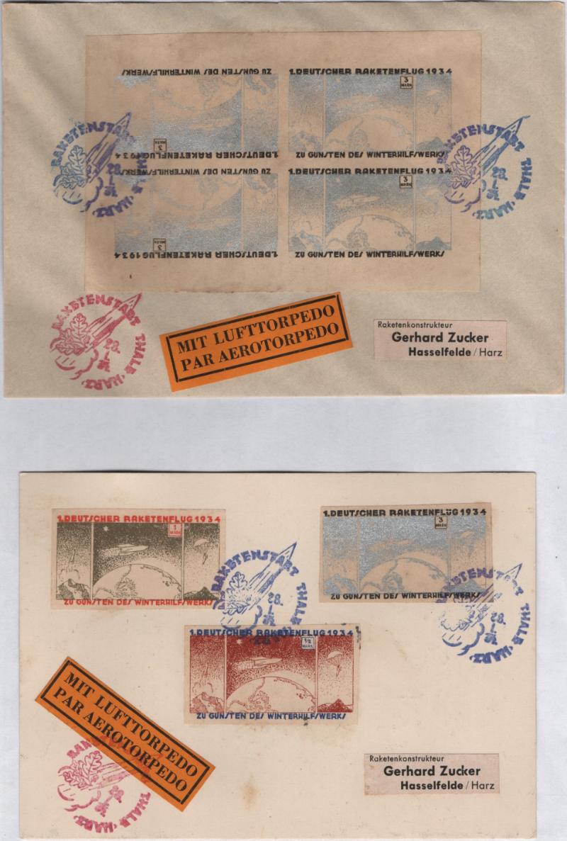 GERMANY 1934 Rocket Mail 1/28/34 Hexentanzplatz flight cover & card (E-Z #6C1, 6C2) addressed to Zucker; cover has tete beche mini-sheet of (4) w/ blue & red cachets; card is PPC showing Zucker w/ rocket, imperf stamps ½m, 1m & 3m (6A1, 6A2, 6A3) also w/ blue & red cachets; F-VF (Image)