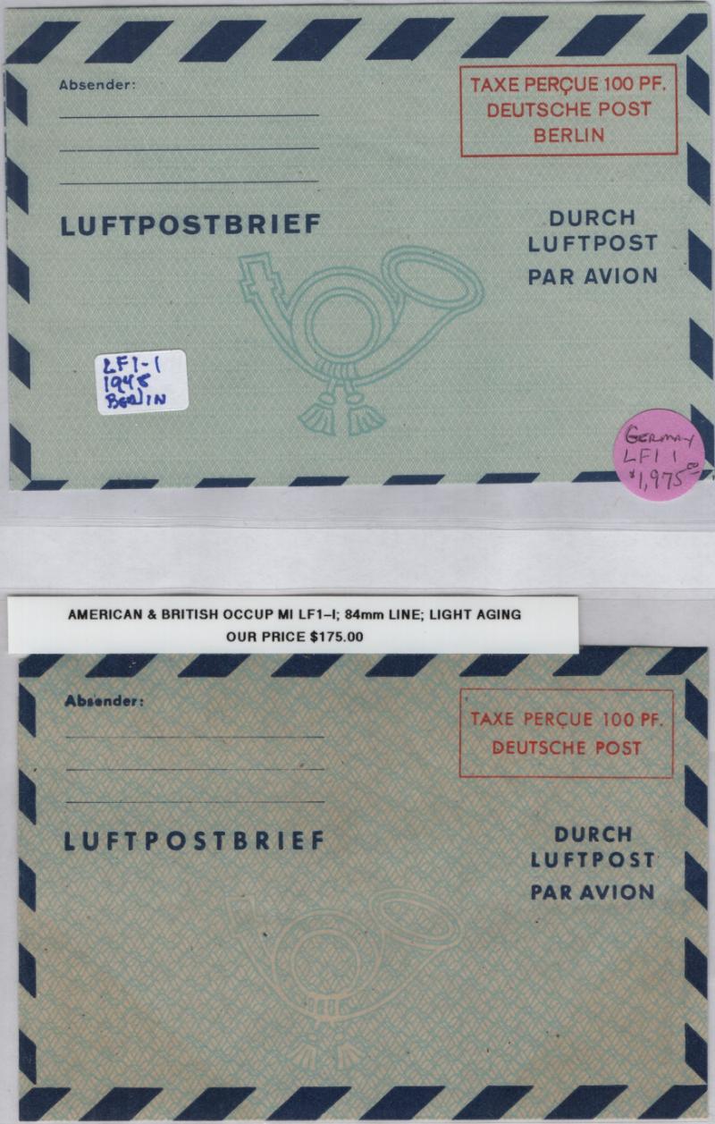 GERMANY Collection unused air letter sheets from American Zone, W Germany & W Berlin; incl Michel LF1 I, LF1 II, LF2 II, LF3-4, LF 4F printing flaw, LF5, LF6a, LF7a; Berlin LF1 I (solid line around post horn, scarce, old CV 2,600 DM), LF1 II, LF2a I, LF2b II, LF2b IV, LF3-6; all sleeved, unused, a couple w/ some light foxing, lacks only a few vars, gen VF (Image)