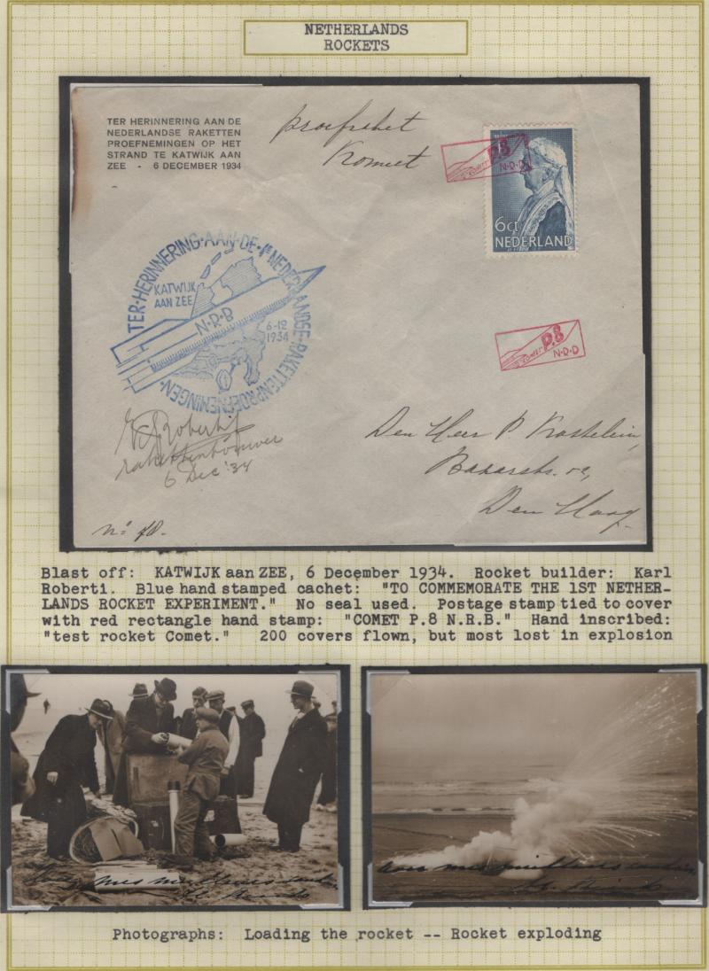 ROCKET MAIL Collection of Netherlands 1934-65; several cvrs & stamps from 1934-35 incl E-Z #2C1 scarce, w/ photo of explosion, 4C1, 5C1, 52A1 both colors sheets/4, 79C1, 82A1a, 82C1, many more; several sgls or multiples of flight labels, some signed; also Lux 3C1-3, 4C2 & a couple Germany; gen F-VF+ (Image)