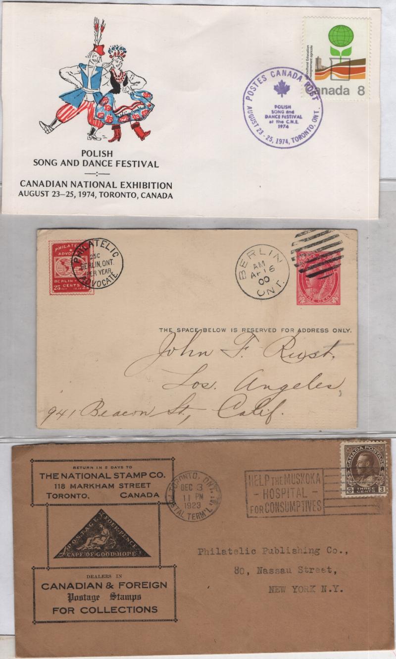 CANADA (350+) Covers related to organized philately; mostly from stamp shows incl cachets, special cancels & labels; also covers / corner cards from stamp dealers, some event covers & more; early to late 20th Cent, franked w/ defins & commems, gen F-VF ex-Trenchard (Proceeds benefit APS) (Image)