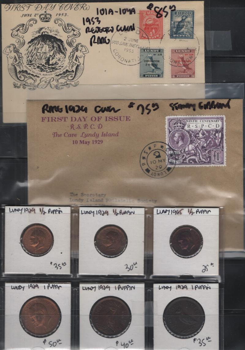 LUNDY ISLAND Accum abt (80) mostly 1950s-90s incl postal cards, FDC, PPC, comml, personal, events & more incl a 1929 1p FDC & 1953 #101A-04A QEII Coronation cancel FDC; also incl (6) Lundy coins; much Puffin topicals, all sleeved; high retail value; gen F-VF (Image)