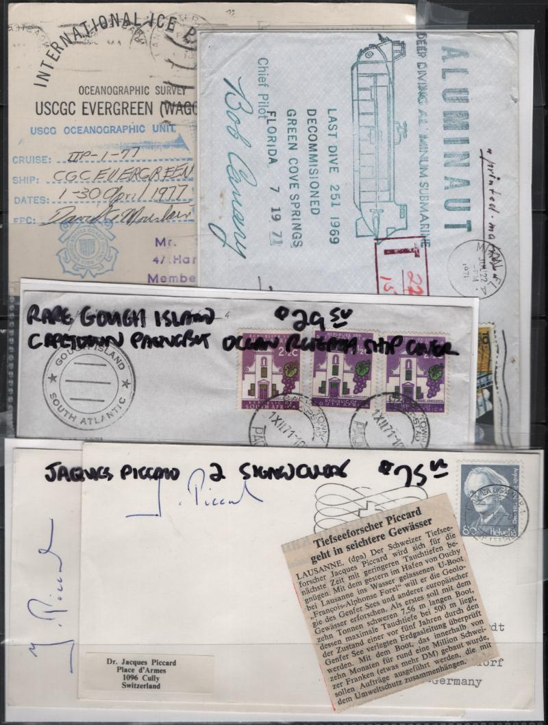 OCEAN RESEARCH Accum abt (750+) ocean research ships & deep sea research submarines; many have crew autographs, handwritten notes on mission, dive depths, locations, also polar items & many other topics on ocean research; also incl (2) Jacques Piccard autograph cvrs; one man's lifetime accum; gen F-VF (Image)
