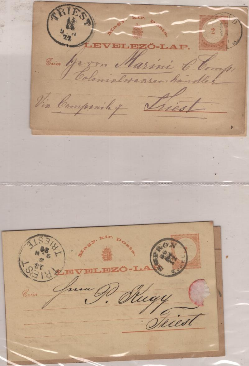 TRIESTE Postal History Collection, some on annotated pgs, others loose, ranges from 1818-1975, incl (12) stampless, Austria #1 on printed matter Trieste to Hall in Tyrol via Innsbruck, numerous Austrian stamped, postal cards, a few w/ Trieste transit or receivers, Hungarian postal cards to Trieste, numerous railway cancels (both Austrian & Italian); Italian Occupation, Italy proper w/ many railroad; good overview, some flts, gen F-VF (Image)