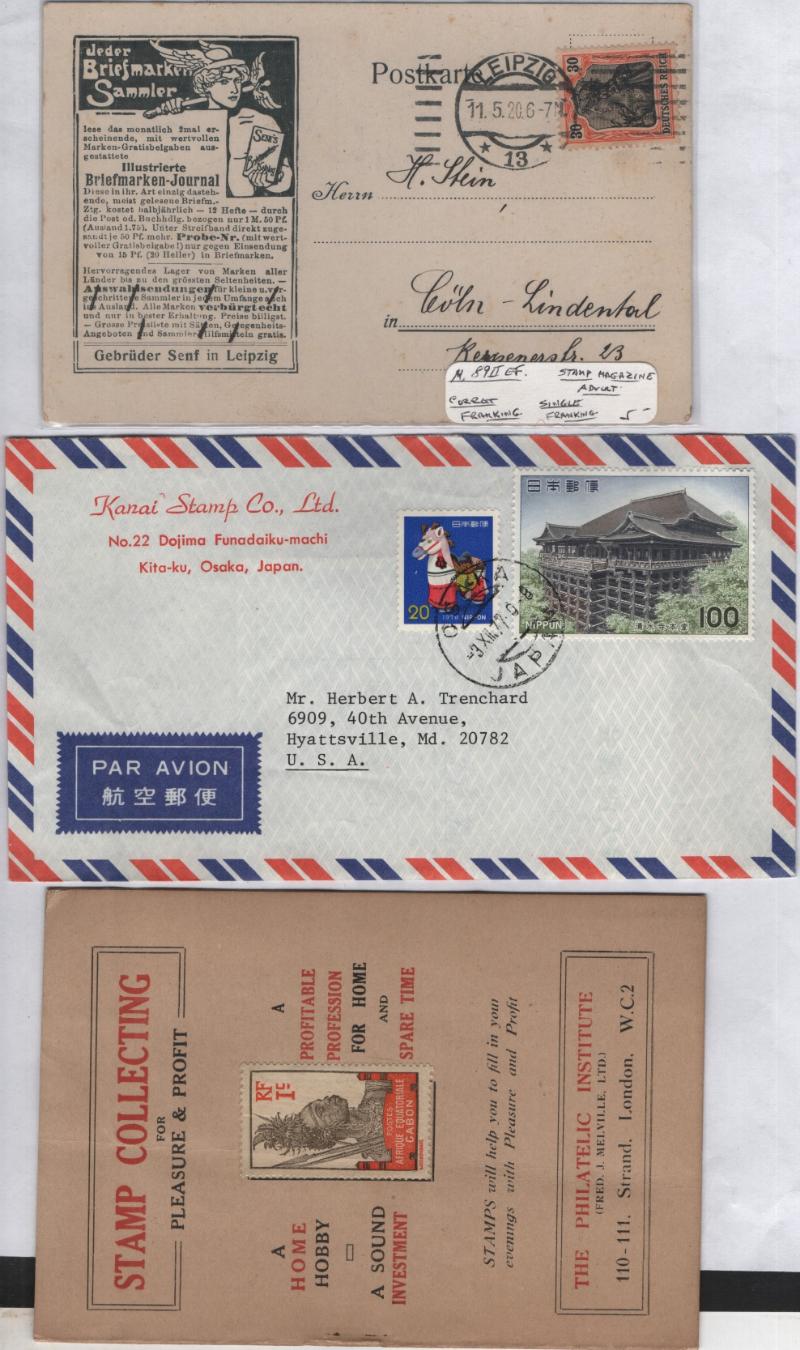 Abt (350) 1910s-70s, mostly philatelic related, incl dealer corner cards, philatelic organizations or publications, a few stamp show items or other souvenirs; some enclosures, PPC, more; some typical wear, gen F-VF, ex-Trenchard (Proceeds benefit APS) (Image)