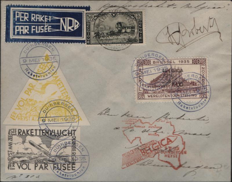 BELGIUM 1935 Rocket Mail cover, two first flight imperf labels (yellow triangle & black) & Brussels Fair label, red handstamp, signed Roberti, 9 May 1935 Duinbergen, numbered 203 (of 500); E-Z #4C1a / Officiel E7, E9 ND) VF (Image)