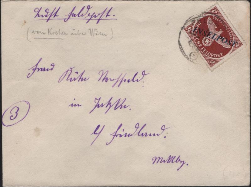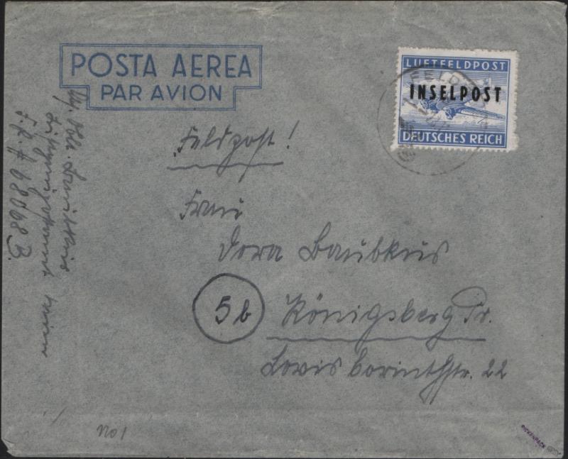 GERMANY Air Feldpost Cover franked w/ red brown stamp,dark blue diagonal "INSELPOST" Ovpt (Michel 10Bb I), tied by indistinct Feldpost cancel, F-VF (Image)