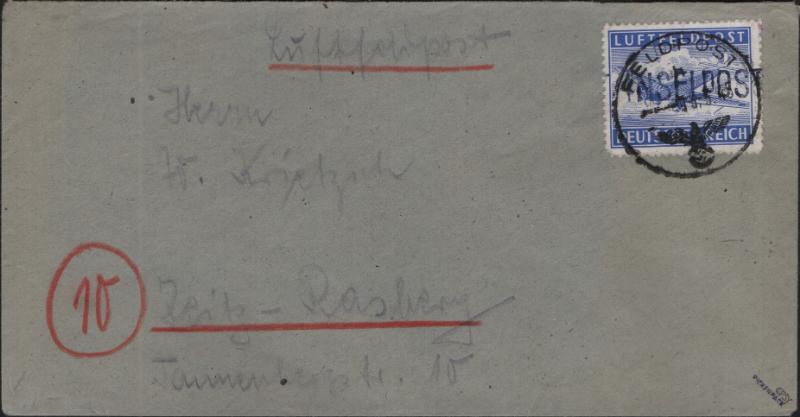 GERMANY Air Feldpost Cover franked w/ red brown stamp w/ bright blue diagonal "INSELPOST" Ovpt (Michel 10Bc), tied by 26 March 1945 pmk, to Reuth; light foxing on reverse, small part ink running, F-VF (Image)