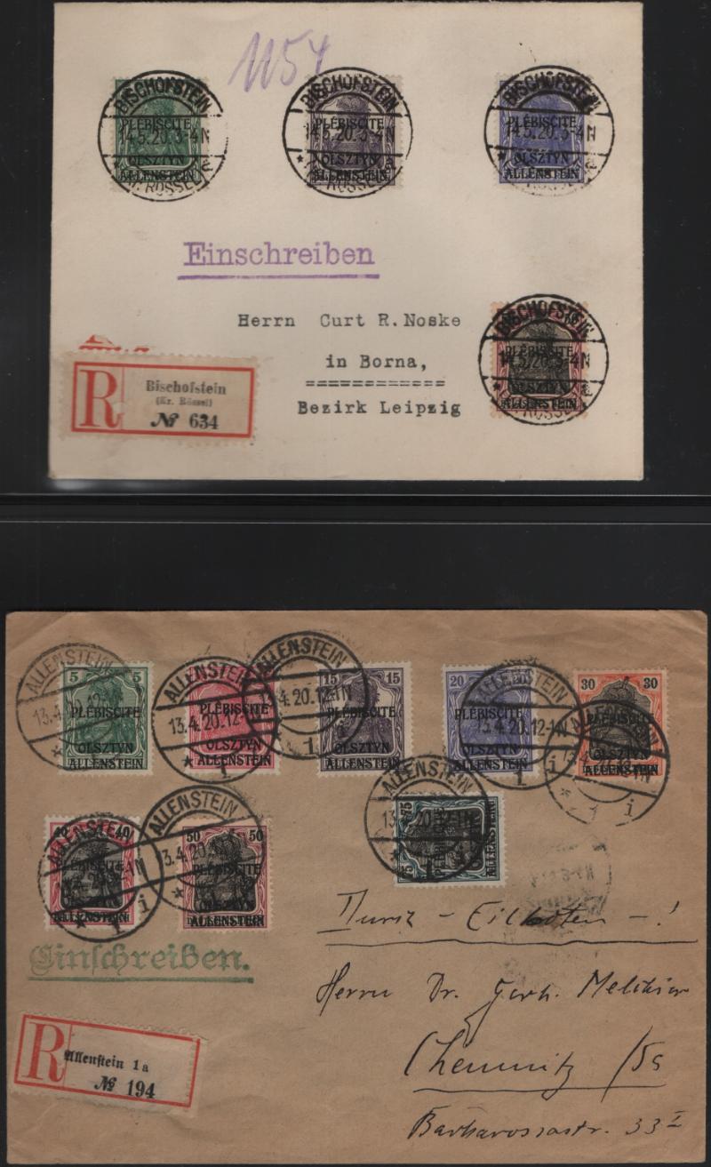 ALLENSTEIN Covers & Stationery from the short-lived Plebiscite; (16) covers incl philatelic & registered, (3) COD, a PPC, single uses of Scott #7, 16, 21, 28; postal cards incl unused Michel K1-2, P1-2, P5, A2-4 & used P1-2, P7; (33) items total, gen F-VF; ex-Stupell (Image)