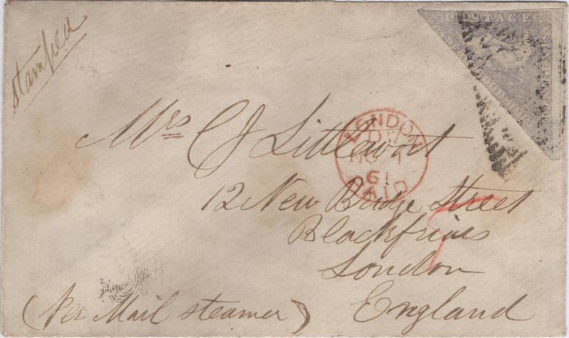CAPE OF GOOD HOPE 1861 Per Steamer cover to London, franked w/ 6d Triangle tied by indistinct black cancel, red Cape Town cds on reverse, some wear, F (Image)