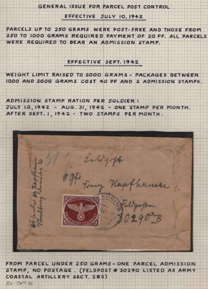 GERMANY 1942 Military parcel post stamp, red brown, perforated (MQ1 / Michel 2A), tied to complete parcel card w/ addressee & sender information, one stamp good for package up to 250 grams; postmarked Nov 1942 at Straubing, to another Feldpost address, F-VF ex-Stupell (Image)