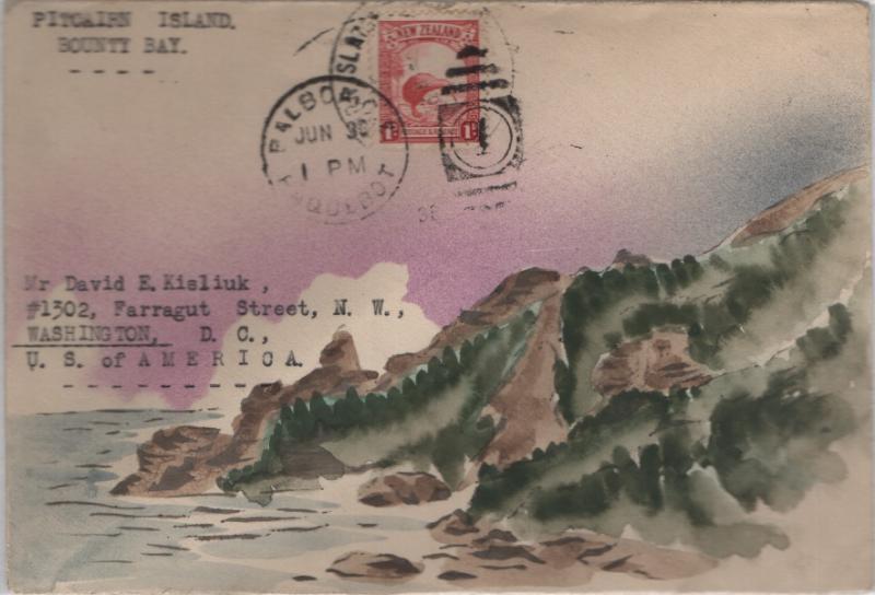 PITCAIRN Karl Lewis hand painted cover to Gallitzin Penn w/ 1935 Pitcairn cancel from New Zealand postal agency cancels (Proceeds benefit APS) (Image)