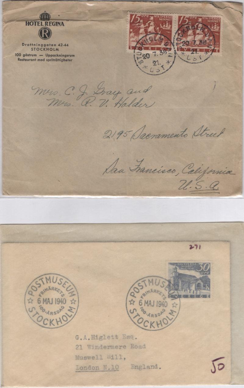 SWEDEN (94) Covers franked w/ the Delaware Tercentenary issue of 1938; incl single use, pairs, mixed frankings and a couple w/ a full set; incl personal & commercial, Jubilee postal card w/ stamps added, censor, corner cards, PPC, airmail, railway cancel, one paquebot canceled Turku, Finland, many foreign destinations, printed matter & more; some annotations, most sleeved, minor typical flts, gen F-VF (Image)