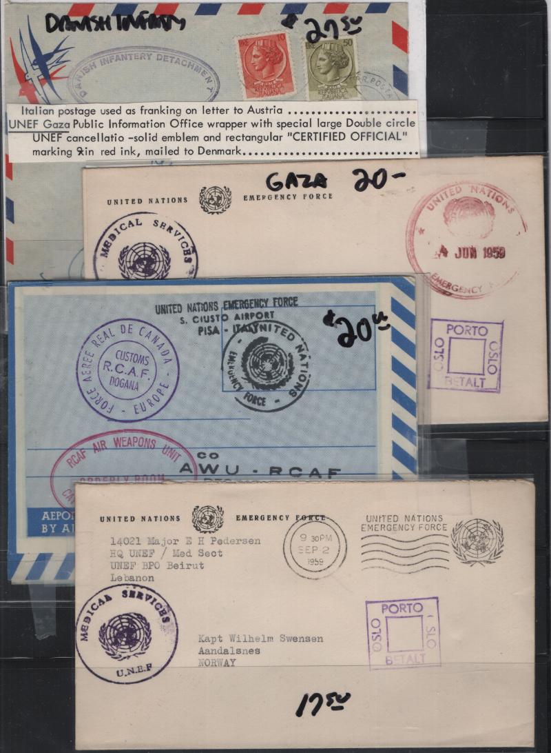 UN EMERGENCY FORCES Accum abt (80) cvrs 1950s-70s incl Canadian, Indian, Norwegian & Swedish emergency forces mail originating from Middle East, also Congo & Cyprus on official stationery, emergency forces air letters & service envs, also a few Ghana items, most sleeved, owner's retail value $1,050 (NV); gen F-VF (Image)