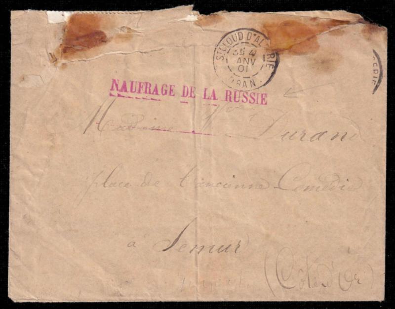 1901 (January 4), St.-Cloud-d’Algerie (Oran) to Semur (Côte-d’Or), shipwreck mail cover, Packet Boat Russie, struck on the front with clear double-circle ST. CLOUD D’ALGERIE ORAN c.d.s. (4 Jan 1901) and bearing the bold red single-line NAUFRAGIE DE LA RUSSIE handstamp denoting recovery from maritime disaster, reverse with delayed transit and delivery markings including Marseille Départ (26 Jan), Dijon Côte-d’Or (27 Jan) and Semur-en-Auxois arrival (27 Jan 1901), the adhesive lost as commonly encountered on wreck-recovered mail, the envelope showing heavy water exposure, staining and surface abrasion as commonly found, a desirable wreck cover.