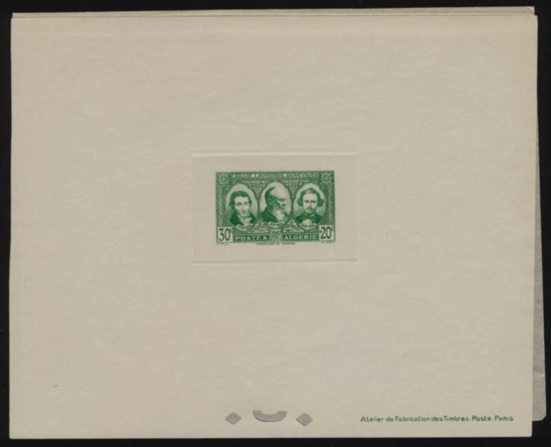 1930s, group of sixteen die proofs, with three sets and one part-set, including the “Taking of Constantine by the French”, “Centenary of Philippeville”, “New York World’s Fair”, and “Pioneers of the Sahara”, all with “Atelier de Fabrication des Timbres Poste. Paris” imprint, very fresh, seldom seen and most attractive (Image1)