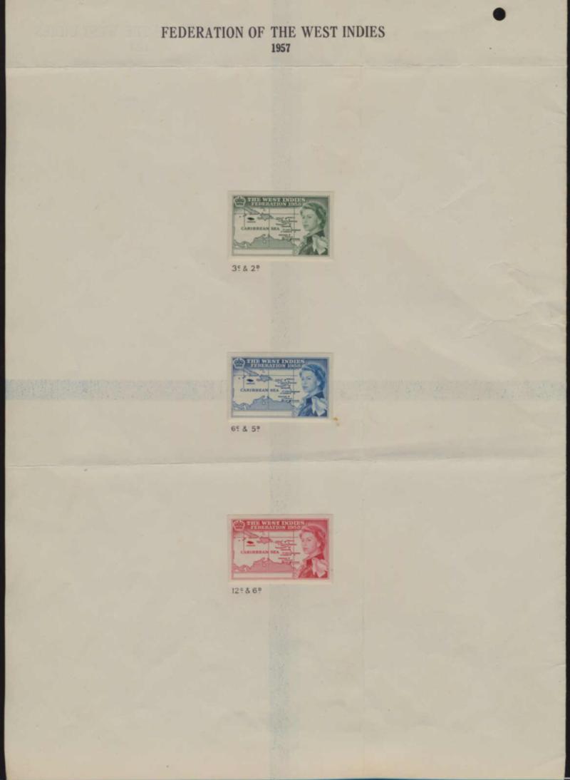 1958, British Caribbean Federation, set of stamp-sized master die proofs, in deep green, blue, and scarlet, mounted within the original presentation folder (approx. 203 × 322mm), each proof annotated below with its respective decimal and sterling denominations, some creasing to the folder clear of the proofs themselves, which are very fine, a rare and important exhibition-calibre British Commonwealth omnibus item. (S.G. 135–137 var.). (Image1)