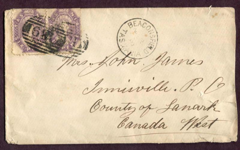 1881 (November 12), Beaconsfield to Innisville, Canada, franked with a pair of 6d red-lilac Chalon issues, perforated 12, paying the 1s foreign letter rate, cancelled by barred numeral “189” obliterators and tied by clear BEACONSFIELD / TASMANIA c.d.s. (12 Nov), to Innisville P.O., County of Lanark, Canada West (Ontario), the reverse with Launceston, Tasmania despatch (21 Nov 1881), Windsor, Ontario transit (2 Jan 1882), Perth, Ontario transit (4 Jan 1882), and a clear Innisville split-ring receiver (5 Jan 1882), negligible edge wear and some imperfections to stamps from being affixed near envelope edge, else fine, and a scarce usage to Canada. (Image1)
