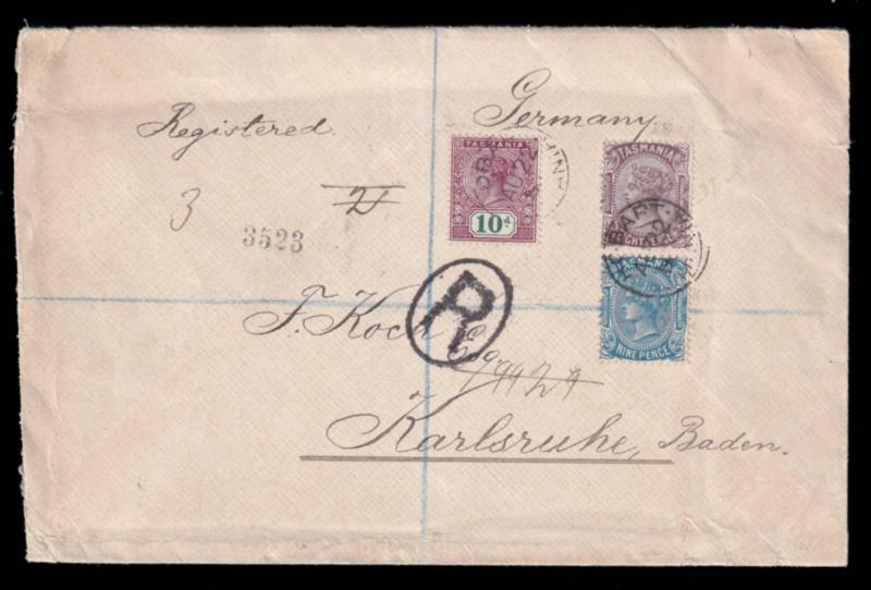 1906 (22 Aug), Hobart to Karlsruhe, Germany, registered cover, franked with 8d, 9d and 10d Tasmanian definitives, tied by clear Hobart / Tasmania c.d.s. (22 Aug) with oval “R” registration handstamp on the front, routed via Italy with Napoli squared-circle transit markings, the reverse bearing Karlsruhe, Baden receiver (30 Sep), light handling wear as expected, else fine, a scarce registered usage to Germany. (Image1)