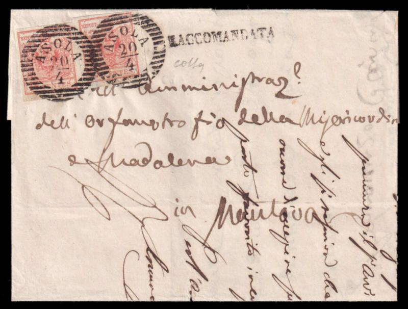 1850 (April 20), registered cover from Asola to Mantova, franked on reverse with 30c brown on ribbed handmade paper, and on front with two 15c red singles, each with large to very large margins, the 15c stamps struck by choice Asola circle-of-bars datestamps, the 30c cancelled by dual RACCOMANDATA straight-lines with framed Mantova handstamp alongside and ornate double-circle “2” above, a lovely and well-composed cover bearing superb examples of this desirable Asola cancellation; signed Colla. (Image1)