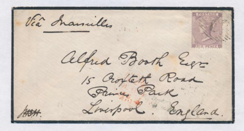1863 (December 3), mourning cover from Constantinople to Liverpool, franked with 6d lilac, Plate 3, tied by fine "C" in barred oval, endorsed "via Marseilles", reverse with British Post Office Constantinople despach backstamp and Liverpool c.d.s. receiver (11 Dec), London split-ring transit on front, scarce and very fine. (Image1)