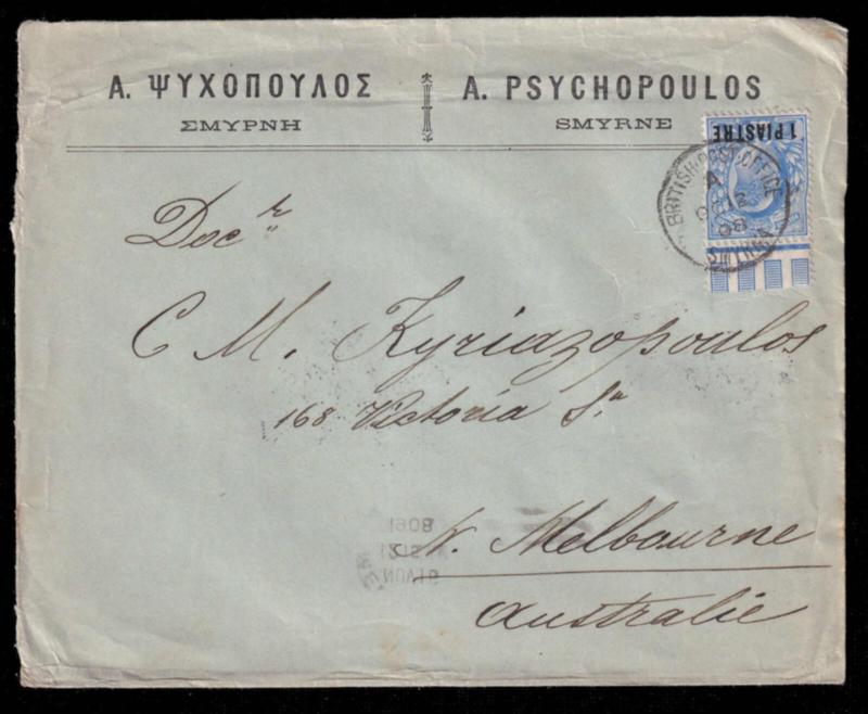 1908 (October 12), Smyrna to Melbourne, uprated postal stationery cover, franked with top margin 1pi on 2½d blue Edward VII Levant issue, tied by 'British Post Office / Smyrna' (12 Oct) cds, showing bilingual 'Alexandria' (17 Oct) and 'Suez' (18 Oct) transits on reverse, with 'Melbourne / Victoria' (16 Nov) flag machine arrival, some wrinkles, else a fine single-franking to a less common destination. (Image1)