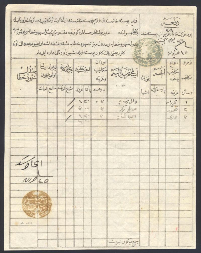 Ottoman Posts in Bulgaria, 1840 "TARTAR POST" letter carrier list, for the route from Filibe (Plovdiv) to Vidin (Widdin), blue-green negative sal of "In janib-i-posta-i-Filibe" at top, Vidin receiving strike at bottom, strikes fair to excellent, the document in better quality than usually found, scarce and fine; with 2013 Todd AIEP certificate. (Image1)