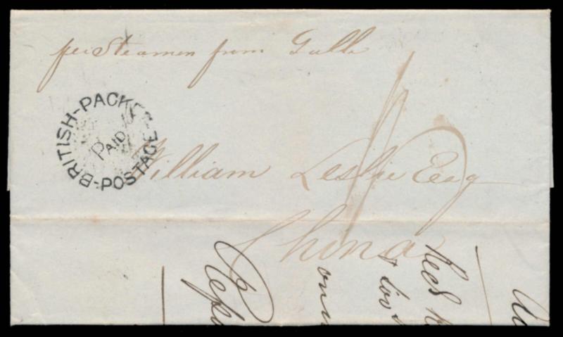 1846 (December 26), Colombo Steamer Letter to Hong Kong, stampless folded letter, with contents datelined Colombo, endorsed "per Steamer via Galle", rated 1/- in manuscript and struck with choice BRITISH PACKET / POSTAGE / PAID handstamp (Proud Type SL8), backstamped with equally select COLOMBO / STEAMER LETTER datestamp with Hong Kong receiver alongside, scarce and very fine. (Image1)