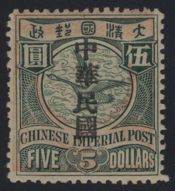 1902–1910, $5 Chinese Imperial Post, green and salmon with black overprint, showing pronounced shift of the principal colours, never hinged, very fine. (Image1)
