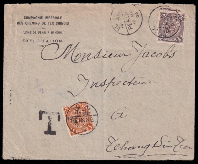 1904 (May 18) Postage Due Cover, Peking to Shanghai. Cover franked with brown ½c Coiling Dragon issue, cancelled by clear bilingual single-circle PEKING 18 MAY 1904 datestamp. The franking was deemed insufficient on despatch, resulting in the application of an ochre 1c “POSTAGE DUE” adhesive and large “T” handstamp, both tied by the same Peking cancellation. The envelope bears the printed corner card of the Compagnie Impériale des Chemins de Fer Chinois (Imperial Chinese Railway Company), Ligne de Pékin à Hankow, and is addressed to Shanghai, adding strong institutional and commercial interest. An attractive and well-documented example of early Chinese postage-due practice. Shallow vertical crease, otherwise sound and well presented. (Image1)