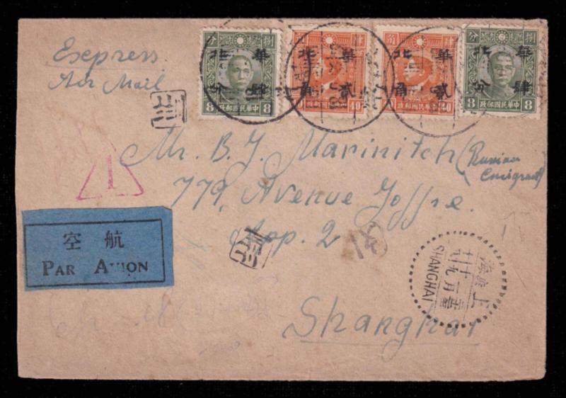 1942 (February 18), Tientsin to Shanghai, "Russian emigrant" censored cover, franked with two 8c green Sun Yat-sen and two 40c orange Huang Hsing (“Martyrs”) issues, tied by multiple bilingual Tientsin c.d.s. (18 Feb), bearing black-on-blue bilingual Air Mail etiquette, manuscript “Express Air Mail,” Chinese chops and a red triangular “1” handstamp on front, the reverse with Shanghai receiver (19 Feb), light wartime handling creases, the sender writing "Russian emigrant" after his name on flap, a fine example of Pacific War mail, with the sender adding social-historical interest. (Image1)