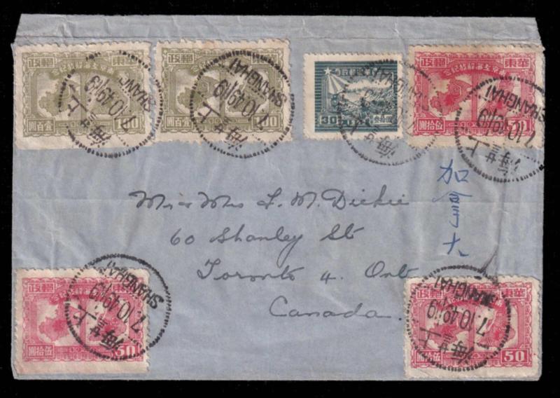 People's Republic, 1949 (October 7), inflation-era cover from Shanghai to Toronto, Canada, franked with East China $30 slate "Train and Postal Runner", three $50 crimson and pair of $100 "Transportation and Tower" issues tied by bilingual Shanghai (7 Oct) c.d.s., sent just six days after the establishment of the PRC; shallow internal creasing, otherwise sound and a scarce transitional usage. (Image1)