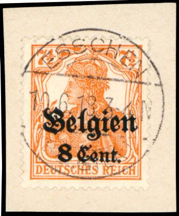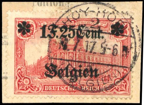 6 F. 25 C. auf 5 Mark grünschwarz/schwärtzlichrosarot, Type I, gestempelt "LÜTTICH 3.5.17" auf Briefstück, Mi. 90.-
