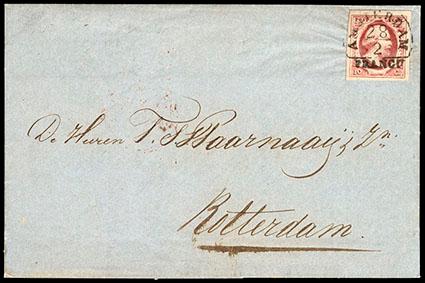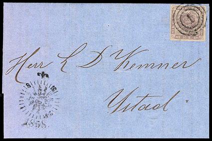 Netherlands, 1852, First Issue, 10c lake. Four large even margins, tied to 1853 folded letter with "Amsterdam, Franco, 28, 2" half-round datestamp, addressed to Rotterdam and backstamped, Extremely Fine, a difficult cover in such fine condition. Michel No. 2. NVPH No. 2. Scott No. 2; Estimate $75 - 100. US$75-100 (Image)