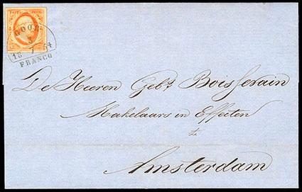 Netherlands, 1852, First Issue, 15c orange yellow. Four nice margins with bright color, tied to 1854 folded letter sheet by superb "Goor Franco 3, 7, 1854" half round datestamp, addressed to Amsterdam, with red backstamp, Extremely Fine, a lovely clean cover in excellent condition. Michel No. 3a. NVPH No. 3. Scott No. 3; Estimate $300 - 400. US$300-400 (Image)