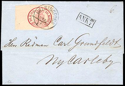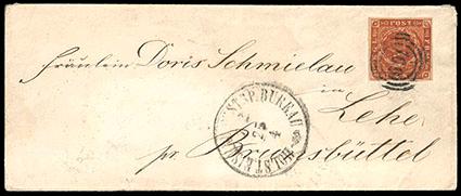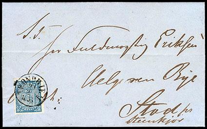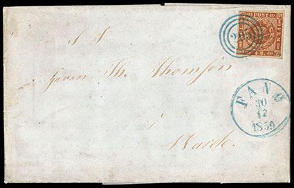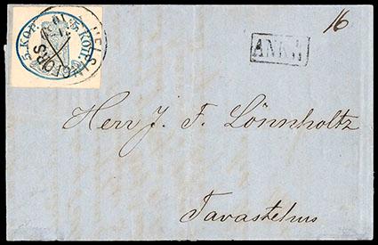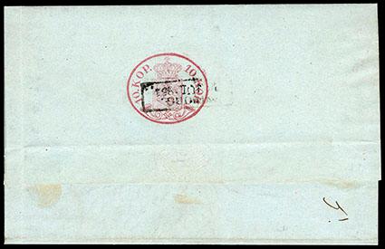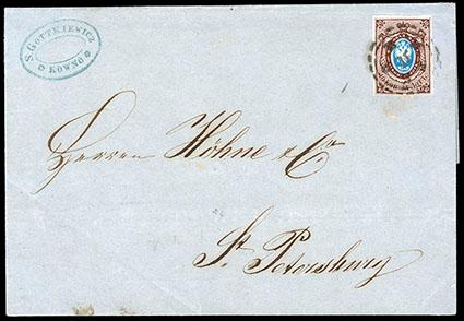AN EXTREMELY RARE EXAMPLE OF THE KOVNO TOWN CANCEL ON A 1857 10K BROWN AND BLUE IMPERFORATE ON COVER. US$1,000-1,500 (Image)