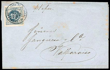 Peru, 1858, Coat of Arms, 1d deep blue. Four balanced margins, tied to folded letter from Tacna to Valparaiso, Chile, with "Tacna Oct 12, 59" cds, this cover was privately carried overland from La Paz, Bolivia via Peru, endorsed "La Paz Sept 23, 1859" on side flap, Extremely Fine. Scott No. 3; Estimate $200 - 300. US$200-300 (Image)