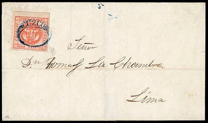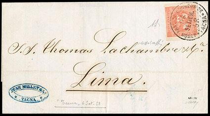 Peru, 1858, Coat of Arms, 1d rose red. With four margins tied on folded letter sheet to Lima, with "Admän Pral De Correos, Tacna, Sept 6, 1858" cds, Extremely Fine, a gem cover, signed G. Bolaffi, A. Diena, with 1968 Bolaffi certificate. Scott No. 4; Estimate $300 - 400. US$300-400 (Image)