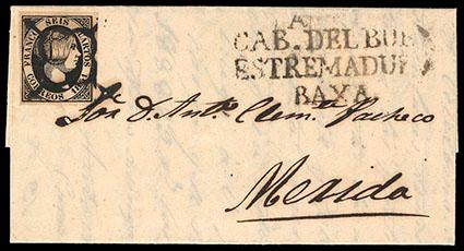 Spain, 1851, Isabella II, 6cu black. Nice fresh color with four large margins, tied to small folded letter by arana (spider) cancel, "A, Cab.Del Buey, S.Extramadura, Baxa" four line postmark at top right, addressed to Merida, Extremely Fine and choice, with 1984 C.E.M. certificate. Edifil No. 6. Scott No. 6; Estimate $150 - 200. US$150-200 (Image)