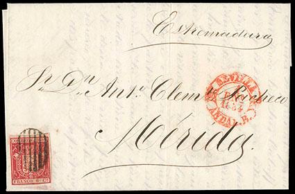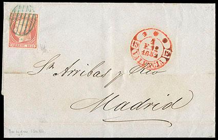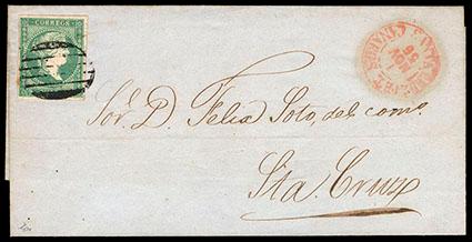A RARE 1852 ISABELLA II 6CU ROSE FIRST DAY OF ISSUE COVER. US$1,000-1,500 (Image)