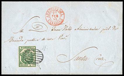Spain, 1854, Arms, 2cu green, thin white paper. Four even margins and deep vibrant color, tied to folded lettersheet to Santa Cruz by neat oval six bar grid handstamp, "Arriceiee Del Canarias, Feb 25, 55" double ring cds in red above, with receiving mark on reverse, Extremely Fine, a wonderful single franking of this scarce stamp, signed Brun and A. Diena. Edifil No. 32. Scott No. 24; Estimate $400 - 600. US$400-600 (Image)
