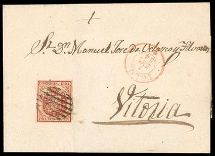 Spain, 1854, Arms, 4cu carmine, thin white paper. Margins clear on 3 sides, barely touching at top, tied on 1855 folded letter sheet from Tolos to Vitoria with barred oval, red "Tolos I Enero, 54 " cds (first day of issue) at right, backstamped "Vitoria 1 Ene, 55"; one side flap missing, Very Fine, a very scarce first day of issue cover. Edifil No. 33. Scott No. 25; Estimate $300 - 400. US$300-400 (Image)