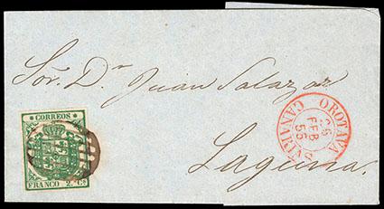 Spain, 1855, 2cu green. Four large even margins, tied by brown grid on small folded lettersheet to Laguna, "Orotava Canarias, Feb 26, 55" cds in red at right, Extremely Fine, a beautiful cover with great eye appeal and scarcity, ex-Provera. Edifil No. 39. Scott No. 36; Estimate $300 - 400. US$300-400 (Image)