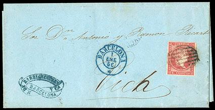 Spain, 1856, 4cu rose. Four large margins, tied on 1856 folded letter from Barcelona to Vich with oval grid cancel, blue "Barcelona 1 Enero, 56" cds (first day of issue) at left, backstamped with "Vich, Barcelona 1 Enero, 56" receiving cds, Extremely Fine, with Graus Certificate. Edifil No. 44. Scott No. 41; Estimate $750 - 1,000.